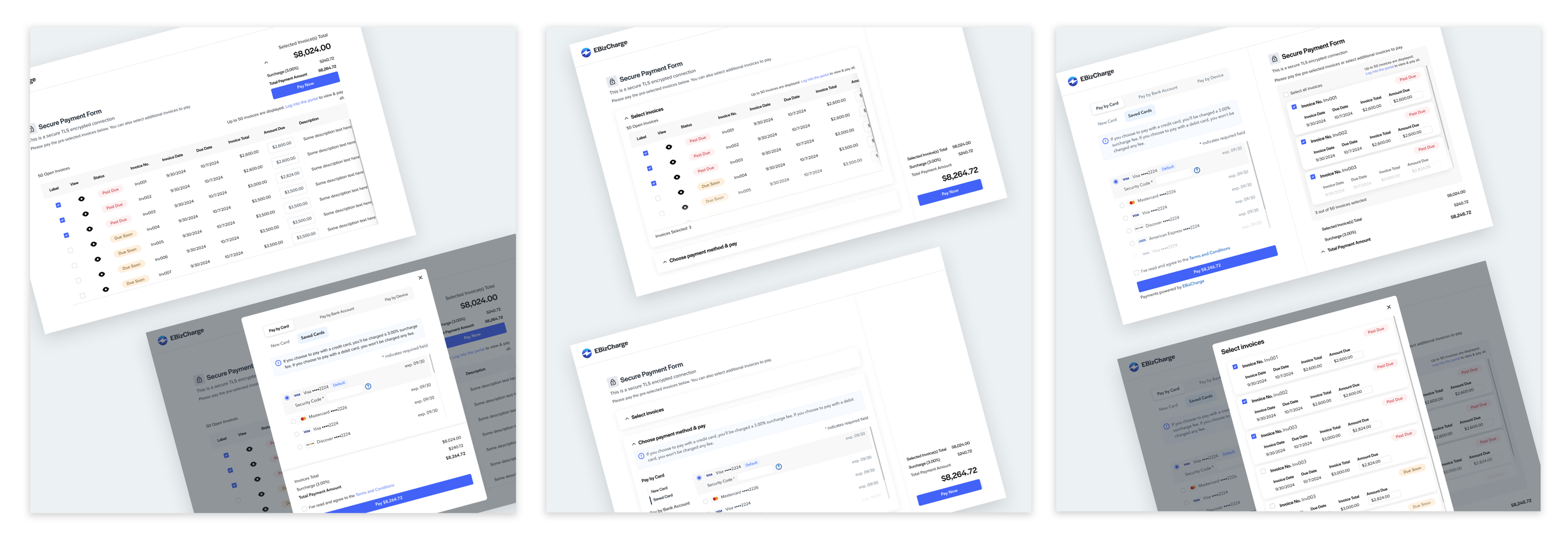 In a UX team review session, I presented five design concepts. The feedback was positive, with two designs selected for further exploration based on their potential to enhance the user experience. In the end, the team chose the fluid workflow option, where the invoice table and payment methods are placed side by side for greater convenience in selecting invoices and a payment method.
