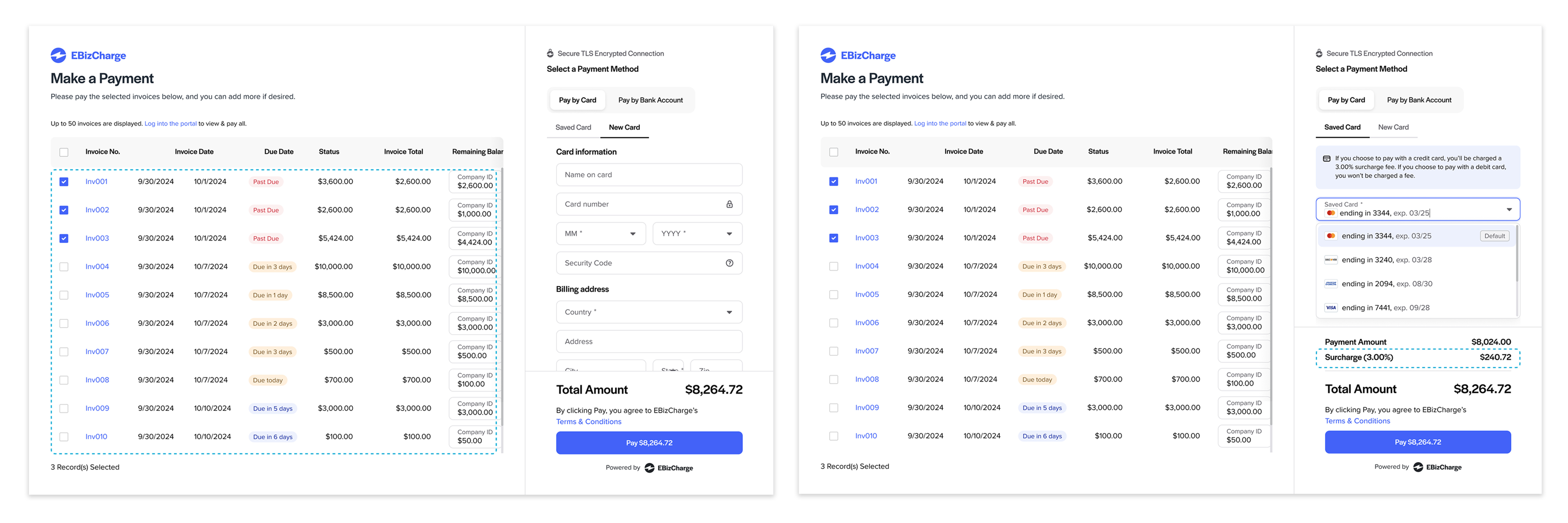 Reflecting on the feedback received, I removed the "Invoice Date" column since it was less critical than the "Due Date," which helped eliminate horizontal scrolling. For the "Surcharge" visibility, after testing different layouts and UI elements in the single-invoice form, we decided to retain the existing multi-invoice design, as it already provided strong readability and supported quick scanning. We then aligned the single-invoice layout accordingly for consistency.